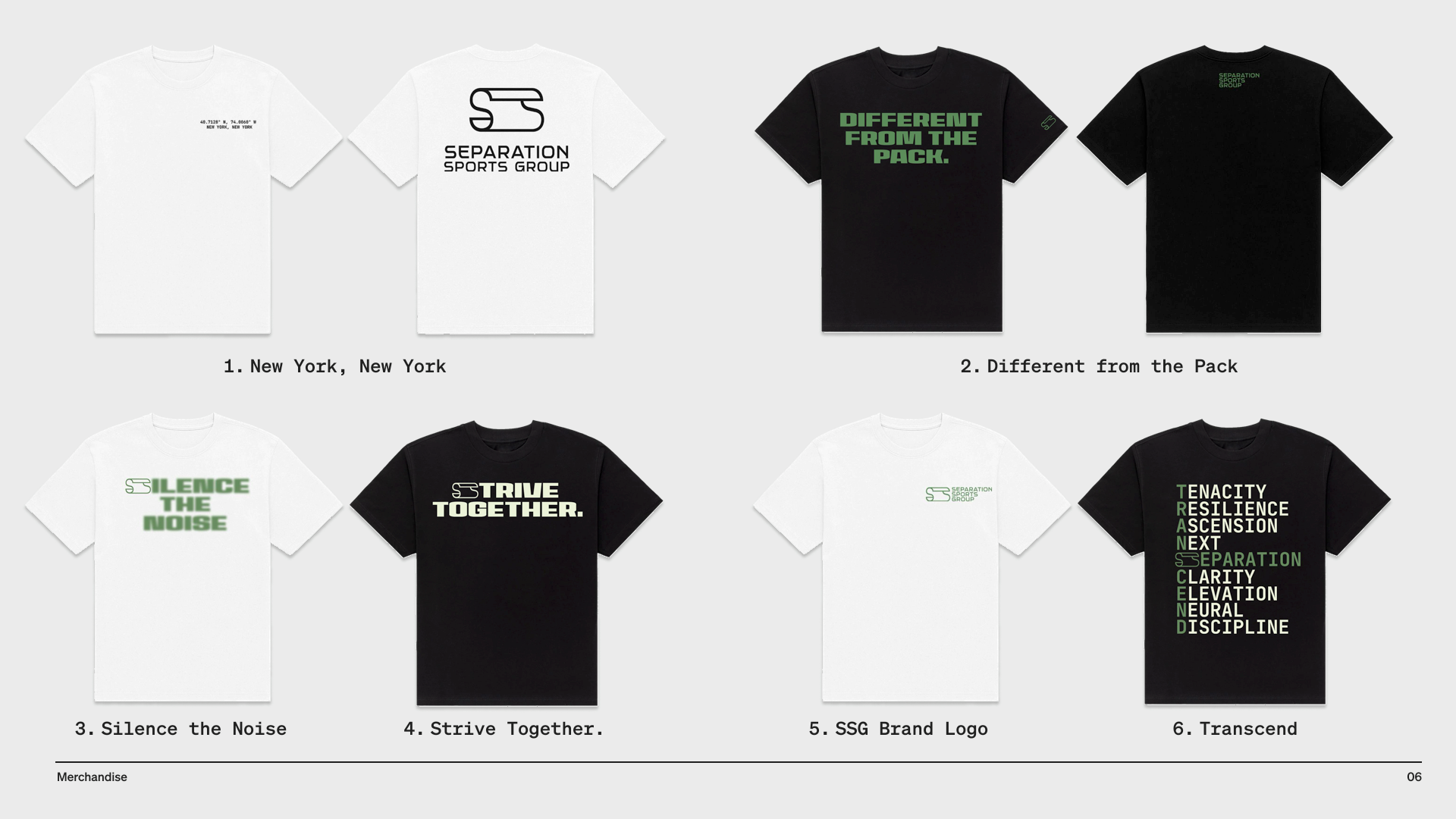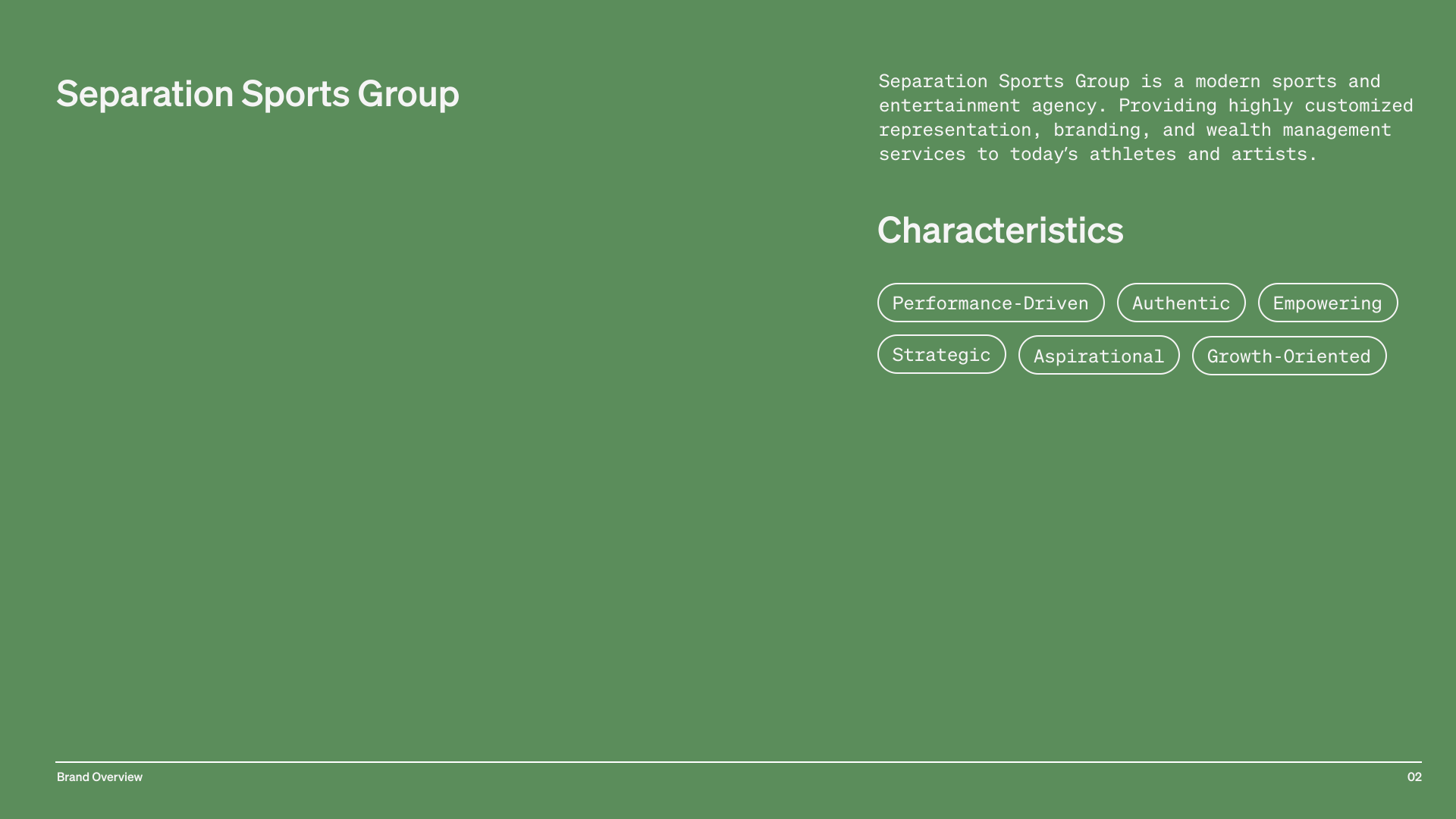 The resulting identity positioned Separation Sports Group (S²G) as a modern, forward-thinking sports and entertainment agency built for today’s athlete-entrepreneurs. The name and mark work together to clearly separate S²G from legacy representation, signaling a more customized, partnership-driven approach to building long-term value. The extended “S” conveys momentum and differentiation, while S²G functions as a concise, memorable name with the flexibility to grow into a recognizable household brand.